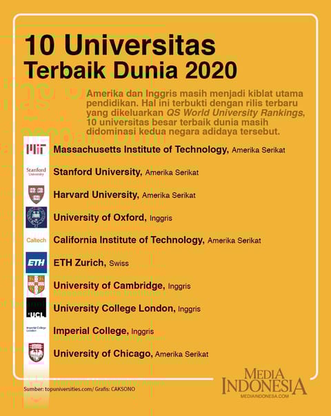 Infografis 28/11/2024 10 Universitas Terbaik Dunia 2020 Diposkan Oleh:administrator infografis(caksono) Amerika dan Inggris Tetap menjadi kiblat Esensial pendidikan. Hal ini terbukti dengan rilis terbaru yang dikeluarkan QS World University Rankings, 10 universitas besar terbaik dunia Tetap didominasi kedua negara adidaya tersebut. Cek Artikel: Media AS Ungkap Perkiraan Raihan Bunyi Biden dan Trump