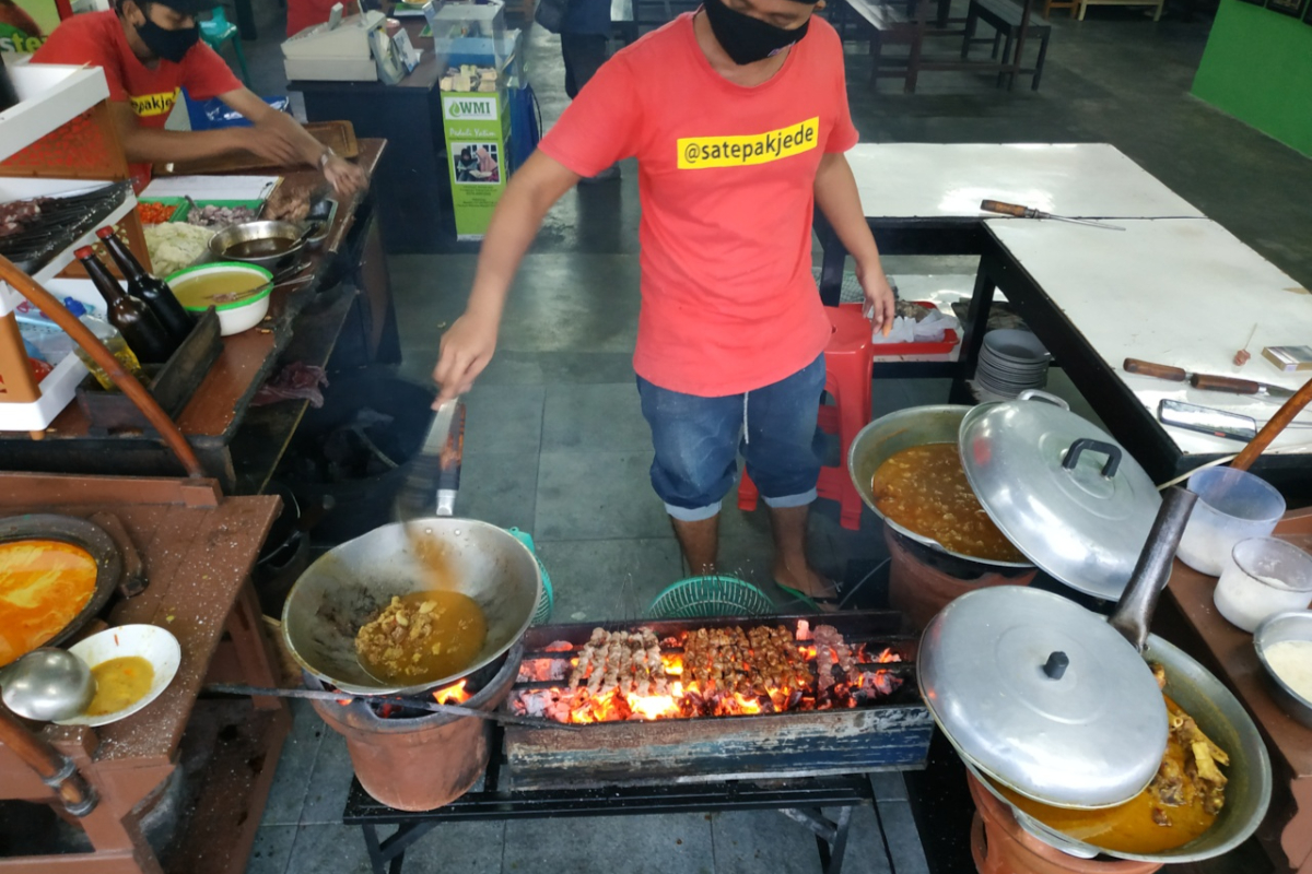 Sate kambing khas Jogja yang ditusuk dengan jeruji besi dan dibakar sempurna. Disajikan dengan kuah gulai yang gurih. Terletak di Pasar Wonokromo, Bantul.