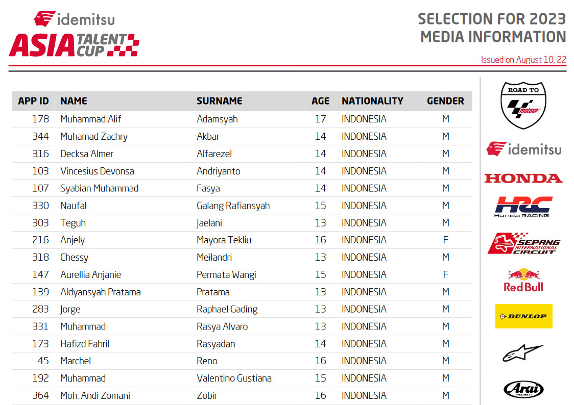 Aplikasi mereka telah dianalisis oleh Komite Seleksi dan 83 pembalap dari 15 negara telah dipilih Buat diundang ke Acara Seleksi 2023. Terdiri dari 7 calon Perempuan dan 76 Pria, mereka berasal dari Australia, China, India, Indonesia, Jepang, Malaysia, Nepal, Selandia Baru, Filipina, Qatar, Singapura, Taiwan, Thailand, Turki, dan Vietnam.
