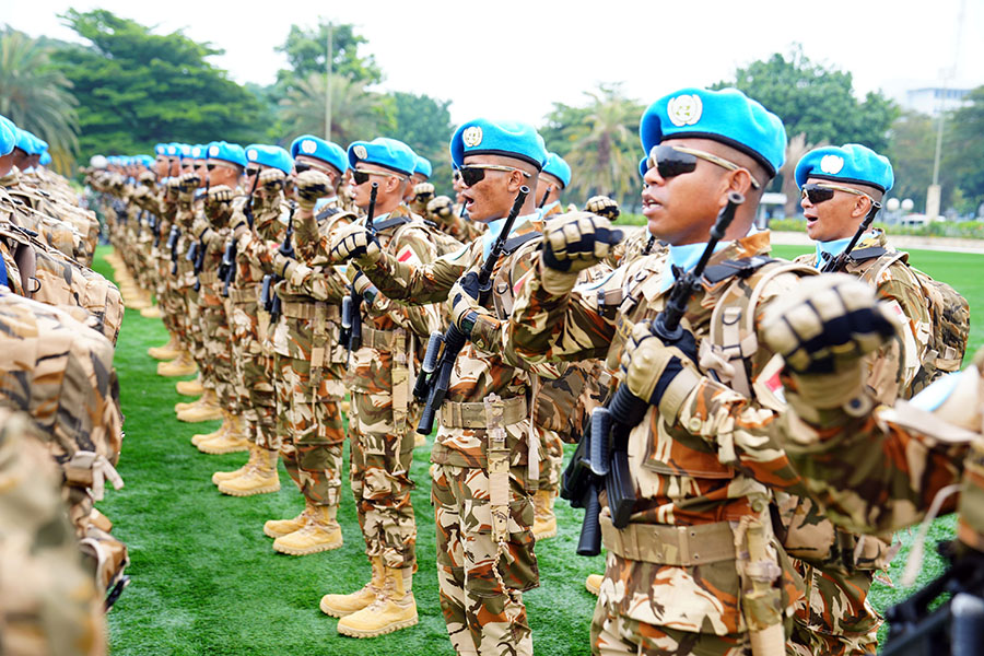 Prajurit TNI meneriakan yel yel seusai upacara pemberangkatan Satgas Kizi TNI Kontingen Garuda XX-V MONUSCO Kongo 2025, di Mabes TNI, Cilangkap, Jakarta, Kamis (19/6/2025). Sebanyak 175 prajurit TNI yang berangkat mengemban misi PBB ke Kongo berasal dari Denzipur 10/KYD Kodam XVII/Cenderawasih. Penugasan ini bukan sekadar tugas luar negeri, melainkan bentuk Konkret kontribusi TNI dalam menjaga perdamaian dan stabilitas dunia. PUSPEN TNI/gus