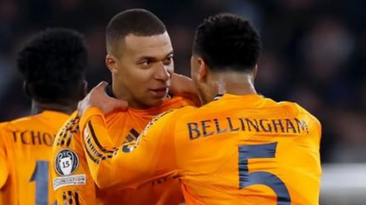 Selebrasi gelandang Real Madrid Jude Bellingham (kanan) Serempak rekan setimnya, Kylian Mbappe (kiri) usai membobol gawang Manchester City. (Foto: Instagram@judebellingham)