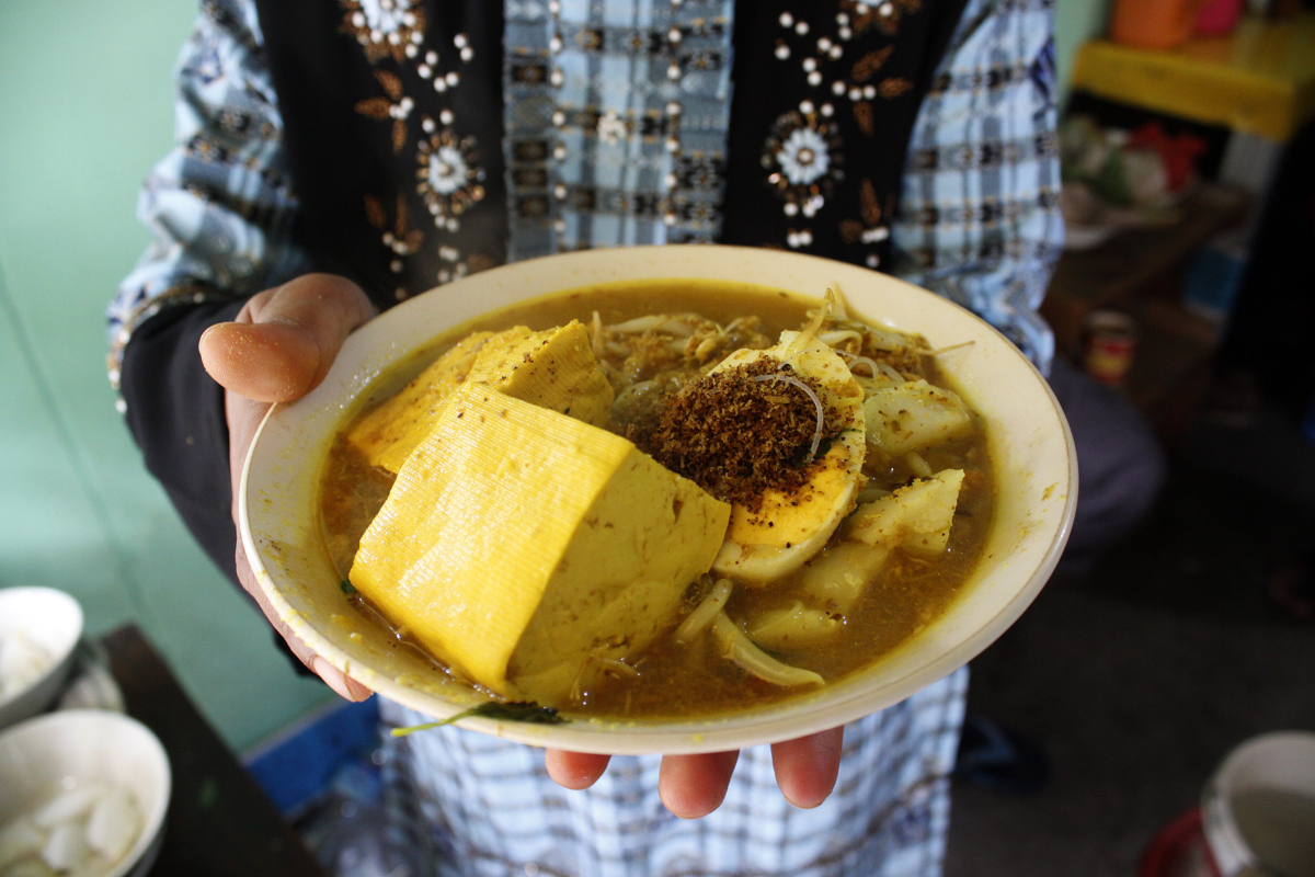 Laksa khas Bogor dengan kuah kuning gurih dan daun kemangi. Isiannya lengkap Terdapat mie, tauge, ketupat, oncom, dan telur.