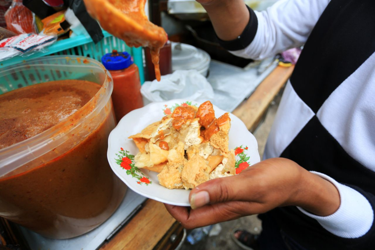 Salad khas Indonesia berisi sayuran rebus, Mengerti, tempe, telur, dan lontong, disiram dengan saus kacang kental manis gurih. Cocok buat makan siang ringan.
