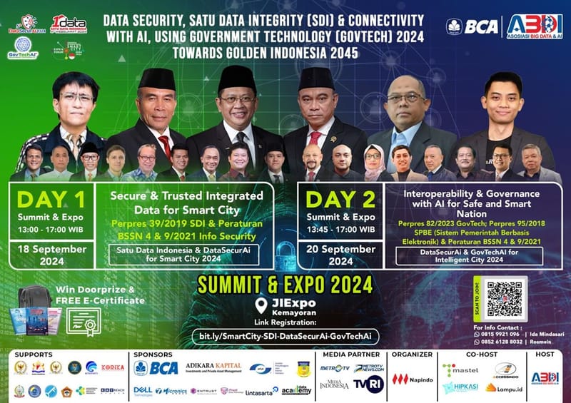 - DataSecurAI, SDI & GovTechAI 2024 Summit di gelar ABDI sebagai Host tanggal 18 & 20 September 2024 bersama SmartCity & IndoSecurity Expo 2024 oleh Napindo sebagai Organizer di JIEXPO.