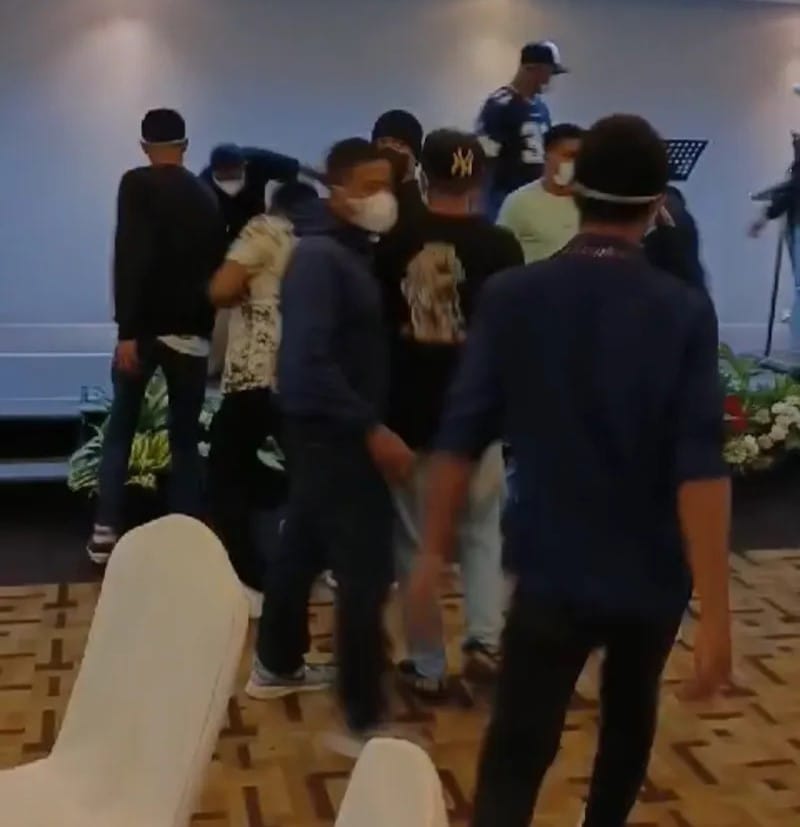 Dalam video yang beredar, sekelompok orang bertindak anarkis menyobek backdrop, spanduk dan berteriak mengancam para peserta yang baru hadir.