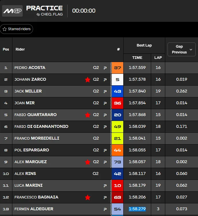 Menit 53 Beberapa Pebalap seperti dimulai Oleh Digia Mulai kembali Ke Trek. Menit 56 Alex Marquez Naik ke P3. menit 57 Acosta memimpin dengan 1:57,559. Dan setelah 60 menit Pedro Acosta Tampil sebagai Yang tercepat sesi Practice MotoGP Sepang 2025 diikuti 4 Motor Jepang. Acosta memimpin 9 pebalap lainnya ( Zarco, Miller, Mir, Quartararo, Digia, Morbidelli, Pol, Alex Marquez, dan Rins ) Langsung ke Q2 esok hari. –