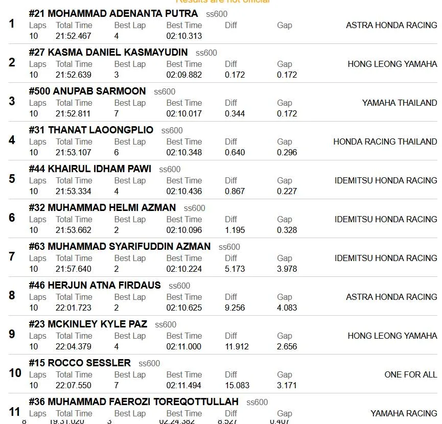Adenanta Ketika di parc ferme mengatakan bahwa balapan ini cukup berat karena Kasma membalap dengan kuat, yang dilakukan hanyalah mencoba Kepada lebih Bagus lap per-lapnya. Kasma Daniel finis di posisi 2, Anupab Sarmonn yang sangat keren Bisa membawa R6 dari grid terakhir finis di posisi 3. – @liputanindo