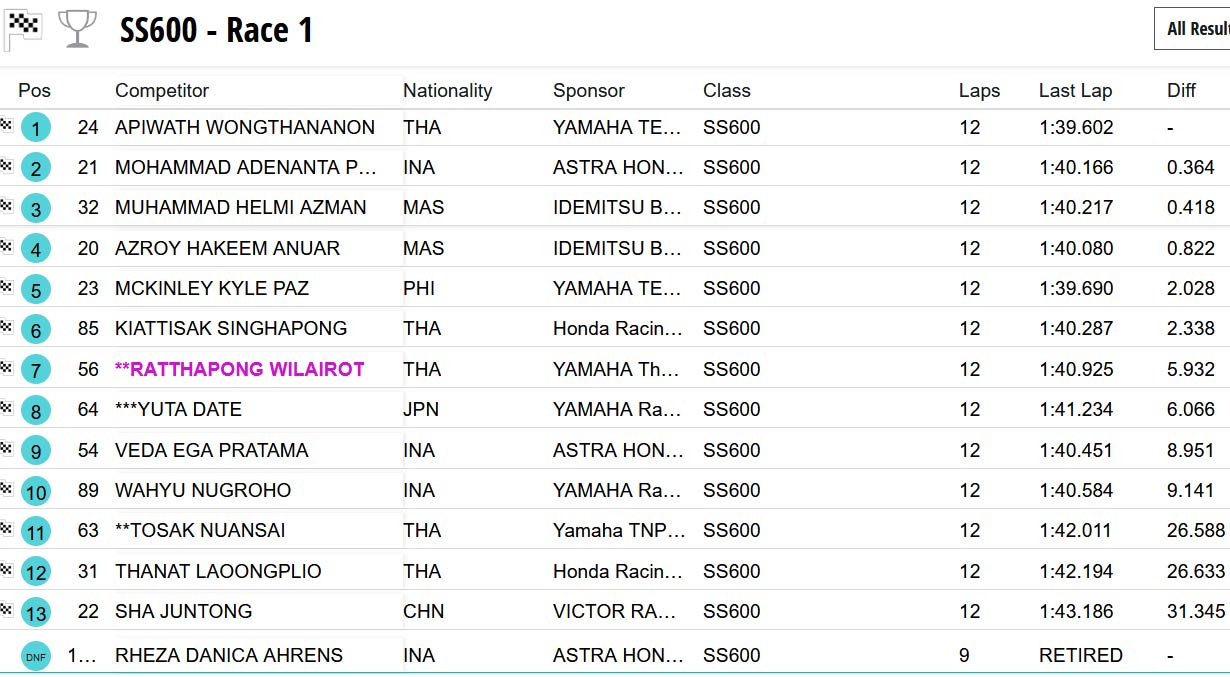 Reza Crash di Lap 10 . Lap 11 Helmi memimpin 0,2 detik ari Apiwat dan Adenanta. Adenanta memimpin tipis adari helmi an Apiwat. Dan akhirnya setelah 12 Lap Apiwat memenangkan Race 1 SS600 Seri Final ARRC Thailand 2024. Adenanta P2 helmi P3 – @liputanindo