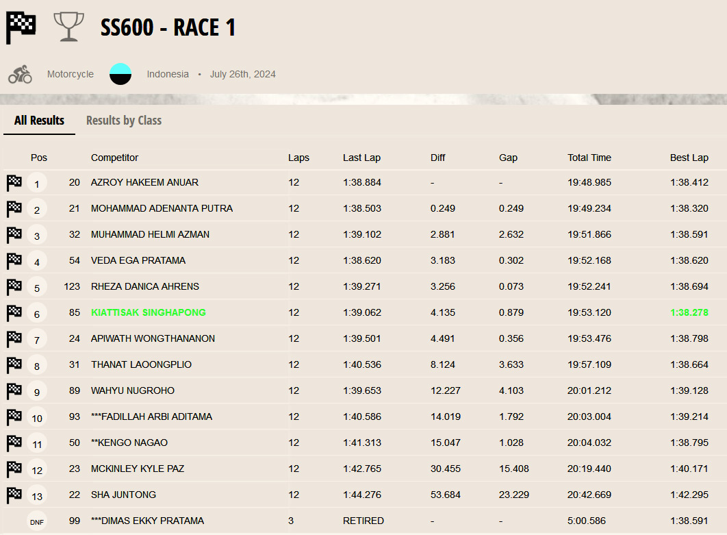 UPDATE : Race Direction telah mengumumkan revisi hasil balapan karena adanya penalti waktu 3 detik yang dikenakan kepada Mohammad Adenanta Putra dari AHRT. Setelah melakukan Overtake ditengah bendera Kuning. Hukuman ini mengakibatkan Adenanta dipindahkan dari P2 ke P4. Alhasil, Veda Ega Pratama dari AHRT naik pangkat dari P4 ke P3.