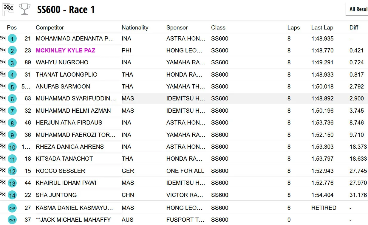 Bergantian dengan Helmi Azman, Wahyu Nugroho Lalu memberikan tekanan kepada Adenanta. Pada lap terakhir Kyle Paz kembali naik ke pack terdepan. Tiba akhirnya Pembalap Astra Honda Racing Team, M Adenanta Putra berhasil membawa CBR600RR memenangkan Race 1 ini disusul McKinley Kyle Paz di P2 dan Wahyu Nugroho di P3. – @liputanindo