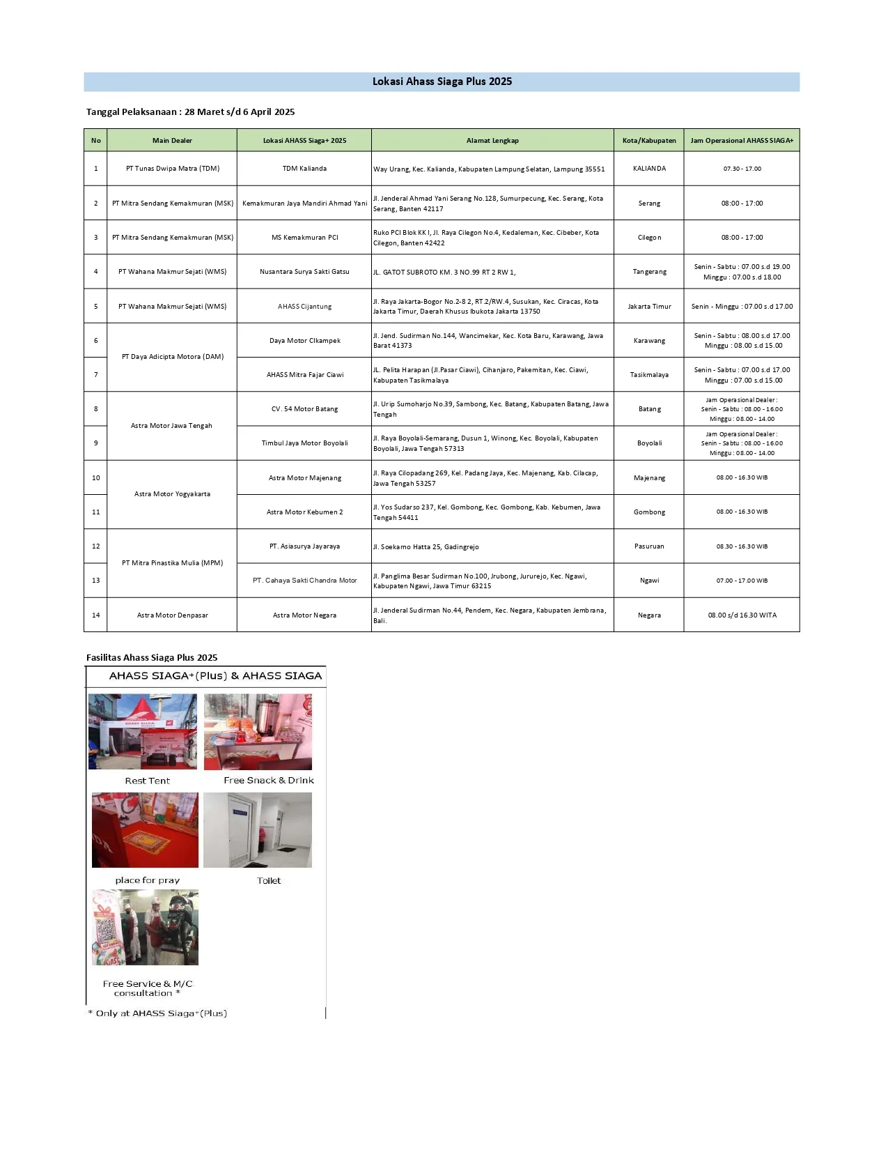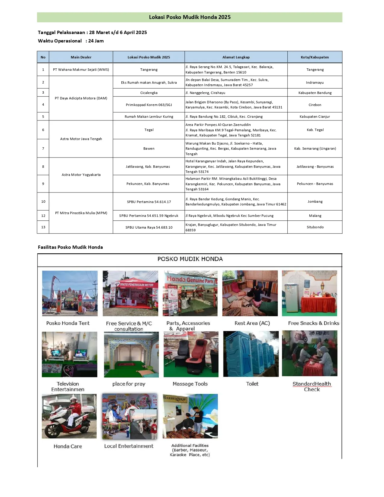 Bale Santai Honda hadir menemani perjalanan mudik bagi konsumen yang melakukan perjalanan dengan sepeda motor. AHM Berbarengan jaringan main dealer menyediakan 177 Bale Santai Honda yang terdiri dari 12 Posko Mudik Honda yang tersebar di pulau Jawa, 14 AHASS Siaga+ yang berada di sepanjang jalur mudik Lampung, Jawa, hingga Bali, serta 151 AHASS Siaga yang berada di Pulau Sumatera, Pulau Jawa, Pulau Kalimantan dan Pulau Sulawesi. Posko mudik ini akan beroperasi dari 28 Maret-6 April 2025 dan dapat dilihat di seluruh di Arsip di Dasar ini.