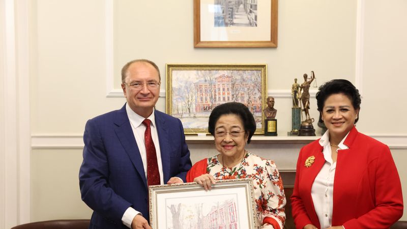 Diketahui, Prof. Dr. Megawati Soekarnoputri mengawali kunjungan kerjanya di Rusia dengan menggelar pertemuan dan ramah tamah dengan Rektor Universitas St. Petersburg Prof. Nikolay Kropachev.