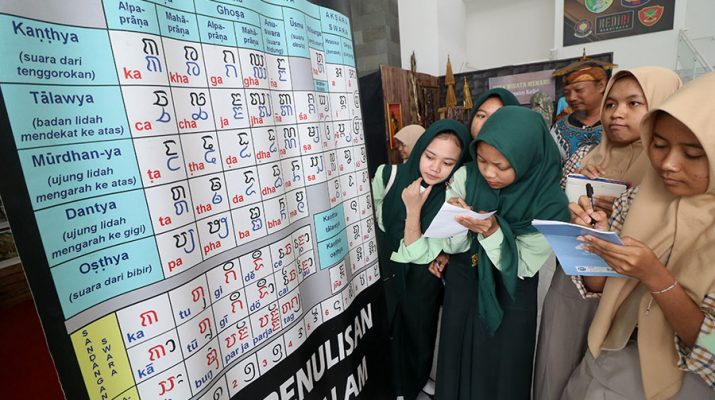 Sejumlah peserta mencoba menulis namanya mengunakan aksara Jawa Antik (Kawi) Demi kegiatan pengenalan aksara Kawi kepada pelajar di Kabupaten Kediri, Jawa Timur, Kamis (19/6/2025). Kegiatan yang diselenggarakan pemerintah daerah setempat Serempak komunitas Ajar Kawi Wetan Wilis tersebut sebagai upaya mengajak pelajar mengunjungi Museum Daerah Kediri sekaligus membaca aksara Kawi yang umumnya terdapat pada prasasti peninggalan era Kerajaan Mataram Antik, Kediri, hingga Majapahit guna menambah wawasan dan mencintai budaya nusantara. ANTARA/Prasetia Fauzani/gus