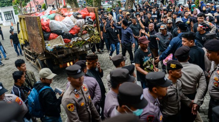 Anggota membuang sampah di depan pintu masuk Kantor Bupati Pandeglang, Banten, Rabu (20/8/2025). Aksi yang diikuti Sekeliling 300 Anggota tersebut merupakan bentuk protes terhadap kerja sama Pemerintah Kabupaten Pandeglang dan Pemerintah Kota Tangerang Selatan terkait penampungan sampah di TPA Bangkonol, Pandeglang, yang menimbulkan pencemaran lingkungan serta berdampak pada kesehatan masyarakat Sekeliling.