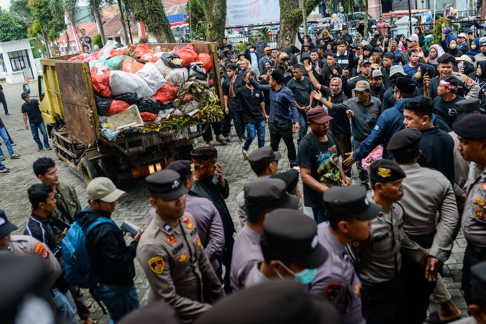 Anggota membuang sampah di depan pintu masuk Kantor Bupati Pandeglang, Banten, Rabu (20/8/2025). Aksi yang diikuti Sekeliling 300 Anggota tersebut merupakan bentuk protes terhadap kerja sama Pemerintah Kabupaten Pandeglang dan Pemerintah Kota Tangerang Selatan terkait penampungan sampah di TPA Bangkonol, Pandeglang, yang menimbulkan pencemaran lingkungan serta berdampak pada kesehatan masyarakat Sekeliling.
