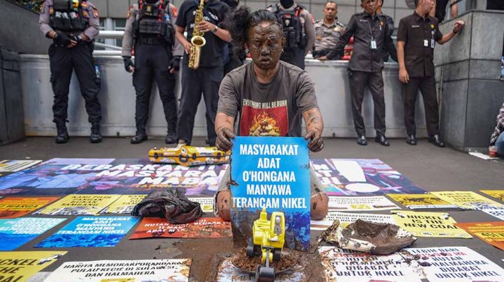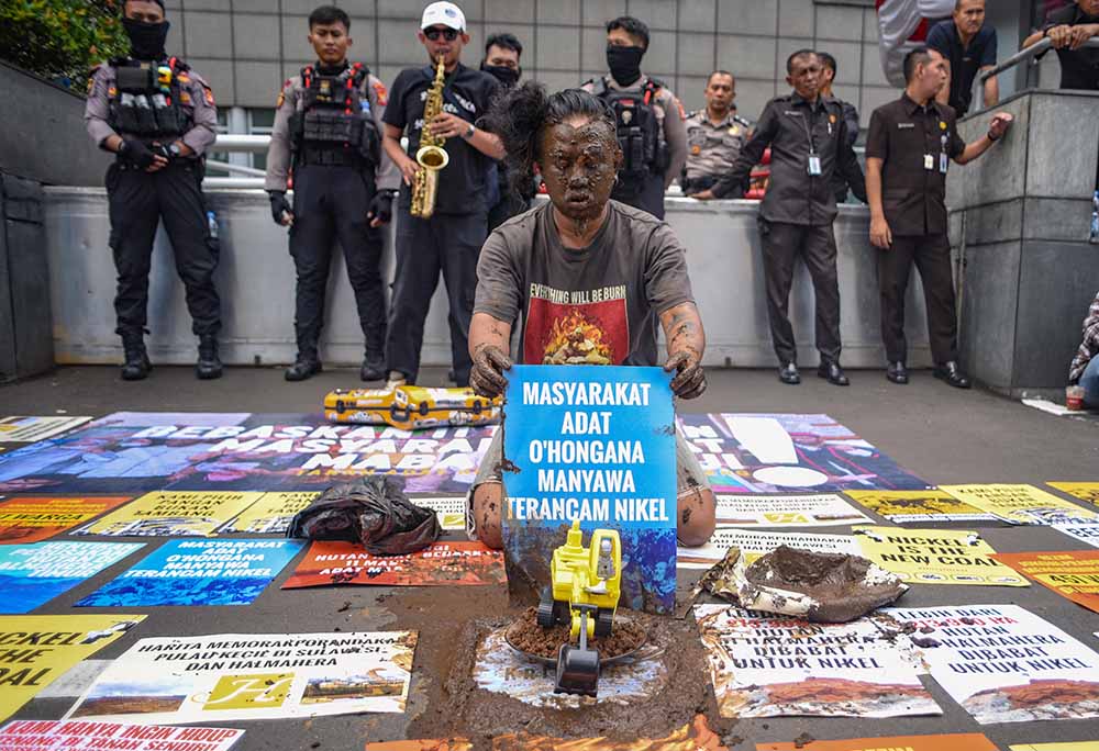 Aktivis lingkungan melakukan aksi teatretikal Demi melakukan aksi damai menolak Perluasan tambang nikel Halmahera Timur, Maluku Utara yang merusak tanah dan hutan adat di Jakarta, Rabu (20/8/2025). Massa juga menuntut pemebabasan terhadap 11 orang masyarakat adat Maba Sangaji yang ditahan karena menolak penggusuran hutan adat. Demi ini, tercatat Terdapat 127 izin tambang dengan total luas 655.581 hektar dinilai telah menimbulkan Pengaruh kerusakan serius terhadap hutan adat, pencemaran lingkungan, hingga penggusuran masyarakat adat dari ruang hidupnya. MI/Usman Iskandar