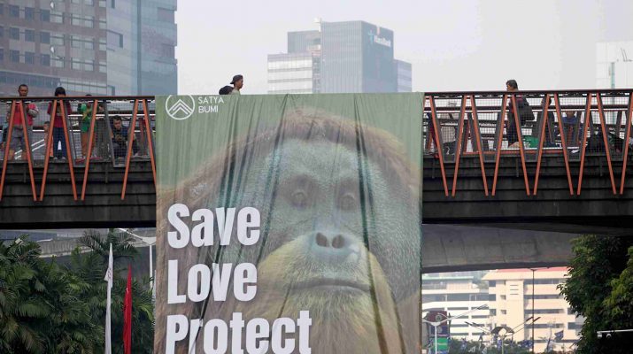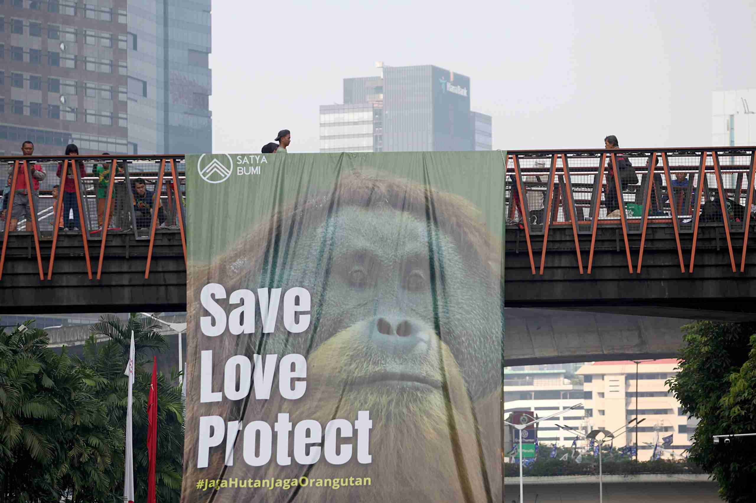 Aktivis lingkungan yang tergabung dalam Satya Bumi dan komunitas sepeda melakukan aksi membentangkan poster Demi memperingati Hari Orangutan Sedunia di Jalan Jenderal Sudirman, Jakarta, Minggu (24/8/2025). Aksi tersebut Demi memberikan pemahaman kepada masyarakat luas akan keberadaan Orangutan yang semakin tersingkirkan sekaligus memeringati Hari Orangutan Sedunia yang diperingati tiap 19 Agustus. MI/SUSANTO/Ppj