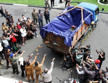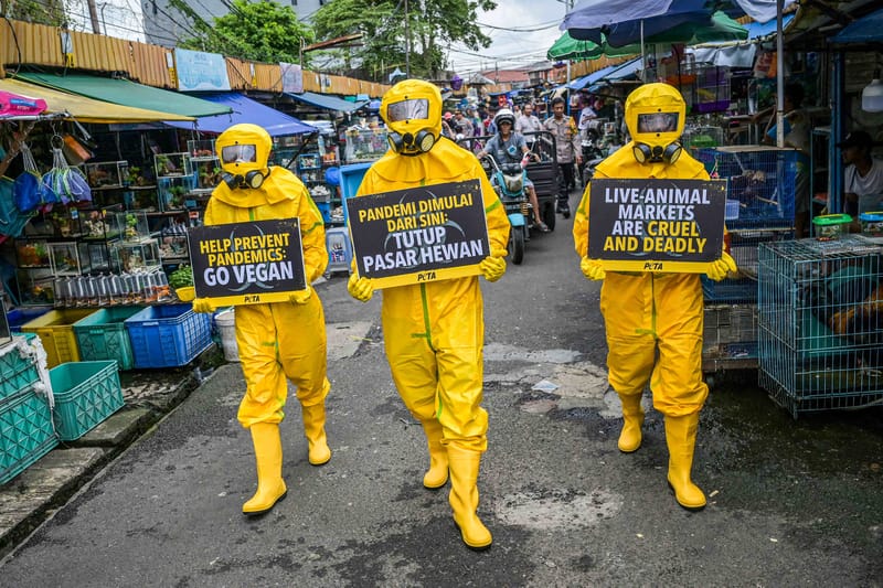 Aktivis People for the Ethical Treatment of Animals (PETA) menggunakan alat pelindung diri (APD) Begitu aksi simpatik di Pasar Hewan Jatinegara, Jakarta, Selasa (12/11/2024). Aksi tersebut bertujuan Kepada mengingatkan masyarakat bahwa kondisi pasar hewan hidup yang kumuh berpotensi menciptakan penyebaran penyakit zoonotik yang mematikan. ANTARA FOTO/Fauzan/Per