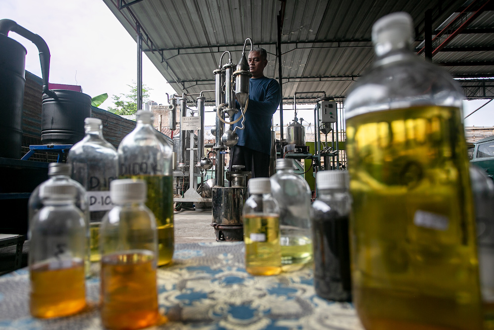 Arif Surono memasukkan biji sampah plastik ke dalam alat pengubah plastik menjadi BBM alternatif pirolisis tabung bertingkat Pitara di rumahnya, Desa Gumpang, Kartasura, Sukoharjo, Jawa Tengah, Senin (2/6/2025). Alat pirolisis tabung bertingkat pengubah sampah plastik menjadi bahan bakar minyak (BBM) alternatif (Pitara) Penemuan Kaum tersebut rencananya akan didorong dan dikembangkan Pemkab Sukoharjo Kepada mengurangi tingginya volume sampah plastik di TPA yang Bisa dimanfaatkan oleh bank desa, koperasi desa dan Bumdes di Sukoharjo. ANTARA FOTO/Mohammad Ayudha/sas