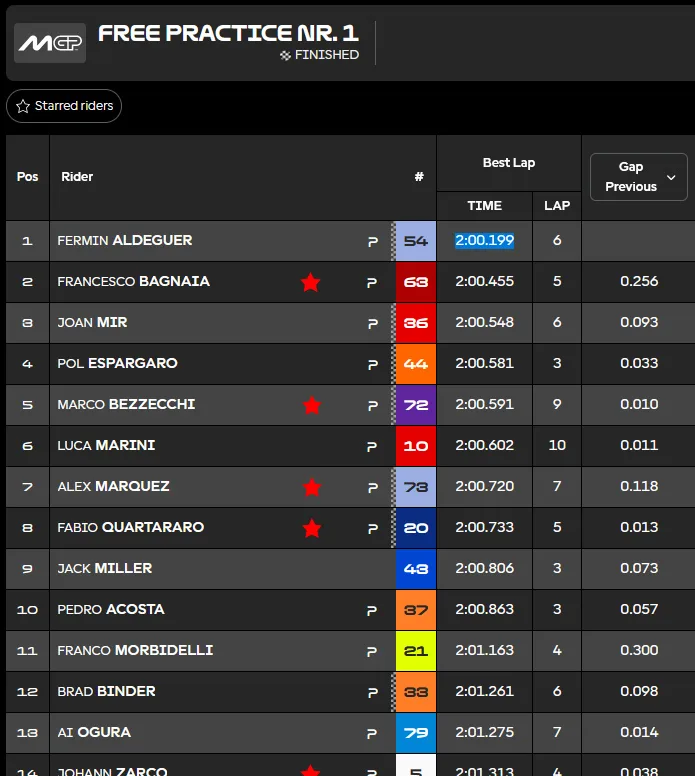 liputanindo.com – Dari 45 Menit sesi FP1 MotoGP Sepang 2025, lebih dari 50% di awal Tetap dalam keadaan trek Kering Tetapi berawan, Tetapi di akhir Akhir Sesi Hujan Mulai turun Ketika Femin Aldeguer memimpin Timesheet dengan 2:00,199 diikuti Pecco Bagnaia