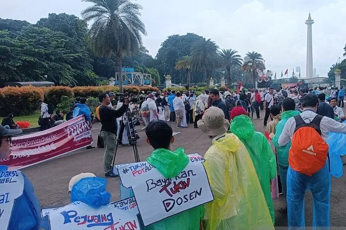 Aliansi Dosen ASN Kemdiktisaintek Seluruh Indonesia (ADAKSI) menggelar penyampaian pendapat di depan Patung Kuda guna menuntut pemerintah Kepada membayarkan tunjangan kinerja (Tukin) yang Enggak dibayarkan sejak 2020.