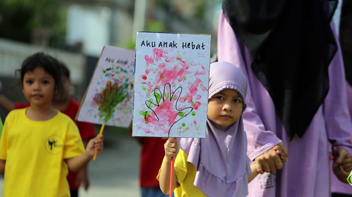 Murid Pendidikan Anak Usia Pagi (PAUD) dan murid Taman Kanak kanak (TK) Serempak gurunya membawa poster berjalan kaki Demi menggelar karnaval di lingkungan Sekolah Harsya Ceria, Banda Aceh, Aceh, Kamis (24/7/2025). Sekolah Harsya Ceria yang merupakan sekolah inklusi perpaduan pendidikan reguler dan pendidikan anak berkebutuhan Tertentu di daerah itu memperingati Hari Anak Nasional (HAN) dengan kegiatan karnaval membawa poster yang bertuliskan Anak Giat, Anak Hebat, Anak Disiplin dan Anak Ceria Buat Indonesia Kuat Menuju Indonesia Emas. ANTARA/Ampelsa/gus