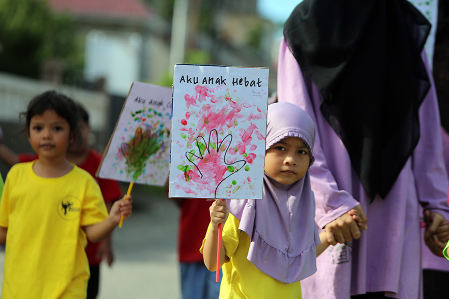 Murid Pendidikan Anak Usia Pagi (PAUD) dan murid Taman Kanak kanak (TK) Serempak gurunya membawa poster berjalan kaki Demi menggelar karnaval di lingkungan Sekolah Harsya Ceria, Banda Aceh, Aceh, Kamis (24/7/2025). Sekolah Harsya Ceria yang merupakan sekolah inklusi perpaduan pendidikan reguler dan pendidikan anak berkebutuhan Tertentu di daerah itu memperingati Hari Anak Nasional (HAN) dengan kegiatan karnaval membawa poster yang bertuliskan Anak Giat, Anak Hebat, Anak Disiplin dan Anak Ceria Buat Indonesia Kuat Menuju Indonesia Emas. ANTARA/Ampelsa/gus