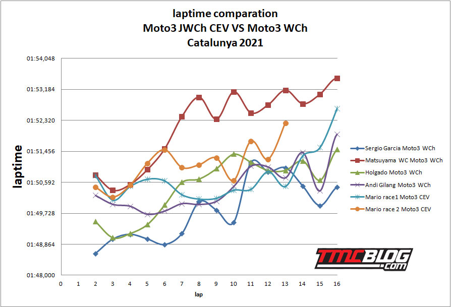 Apabila dibandingkan di race 2 terlihat memang pace Mario Juga Berada di level Rombongan tedepan dan secara Lumrah juga Tak banyak berbeda dengan pace Pemenang race 2 Daniel Holgado, Sekarang Kita bandingkan data Mario dengan data Balapan moto3 Sepekan sebelumnya yah : Sergio Garcia , Wild card Matsuyama, Relplacement rider Holgado dan Andi Gilang