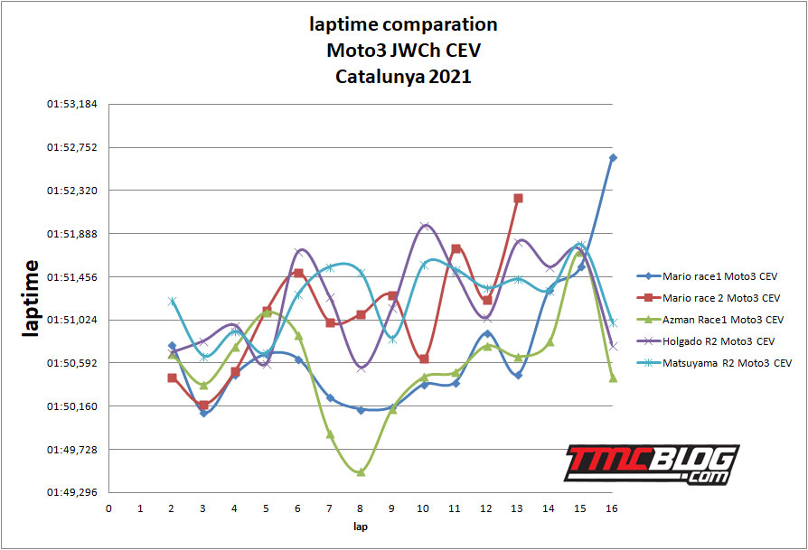 Apabila Kita Lihat di Grafik cacing tawuran di atas Dan bandingkan data data Mario dibandingkan dengan Matsuyama dan dua Pemenang Race 1 dan race 2 CEV Moto3 kemarin  . . Kita Dapat kita lihat bahwa pace Mario Aji di race 1 memang exceptional banget walaupun memang pace Azman terutama di Lap ke 7 Tamat ke 10 memang juga Luar Normal. Pace ini memang layak menjadi pace Podium