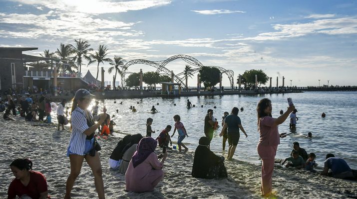 Sejumlah pengunjung berwisata Demi libur hari raya Waisak di Pantai Lagoon, Taman Impian Jaya Ancol, Jakarta, Senin (12/5/2025). PT Pembangunan Jaya Ancol Tbk menargetkan sebanyak 90 ribu pengunjung selama libur panjang hari raya Waisak pada 10-12 Mei 2025. ANTARA/Sulthony Hasanuddin/gus