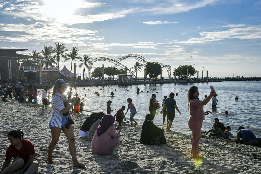 Sejumlah pengunjung berwisata Demi libur hari raya Waisak di Pantai Lagoon, Taman Impian Jaya Ancol, Jakarta, Senin (12/5/2025). PT Pembangunan Jaya Ancol Tbk menargetkan sebanyak 90 ribu pengunjung selama libur panjang hari raya Waisak pada 10-12 Mei 2025. ANTARA/Sulthony Hasanuddin/gus