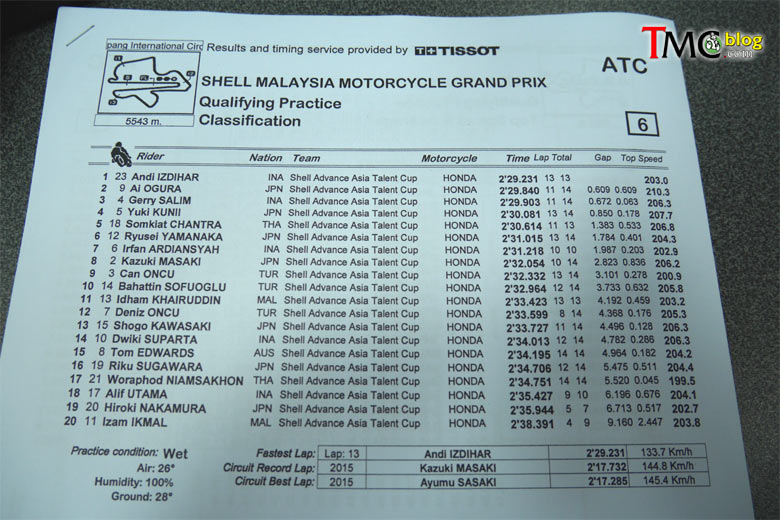 Rupanya Ketika Kualifiaksi Bukan jauh berbeda sob. Andi Gilang menjadi yang tercepat dengan laptime 2:29.231 atau sekiyat 7 detik lebih Segera dari FP2 . . . dan memang Tarck sudah terlihat agak lebih kering Ketika itu Biar Tetap di declare WET oleh Dorna sport. di tempat kedua adalah Ai Ogura 0,609 detik lebih lelet dari Andi gilang dan di grid Ketiga hadir Gery salim dengan Laptime yang 0,672 detik lebih lelet dari Andi Gilang . . .