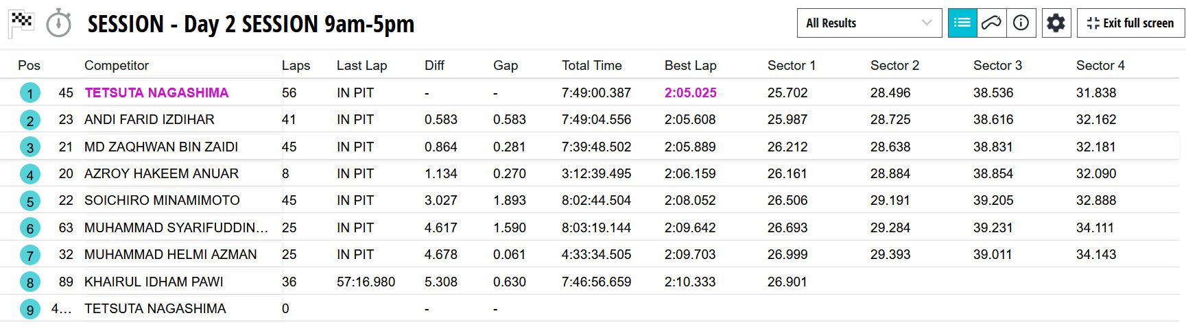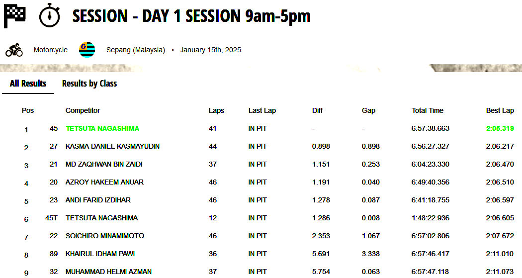 Tetsuta Nagashima sendiri tampil sebagai pebalap tercepat pada dua hari pengujian. Pada pengujian hari pertama menggunakan ban Dunlop, Tetsu menorehkan laptime tercepat 2:05,319 dan Enggak Terdapat pebalap lain yang Dapat menyentuh laptime 2:05 an hari itu termasuk Andi Gilang.