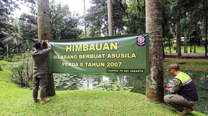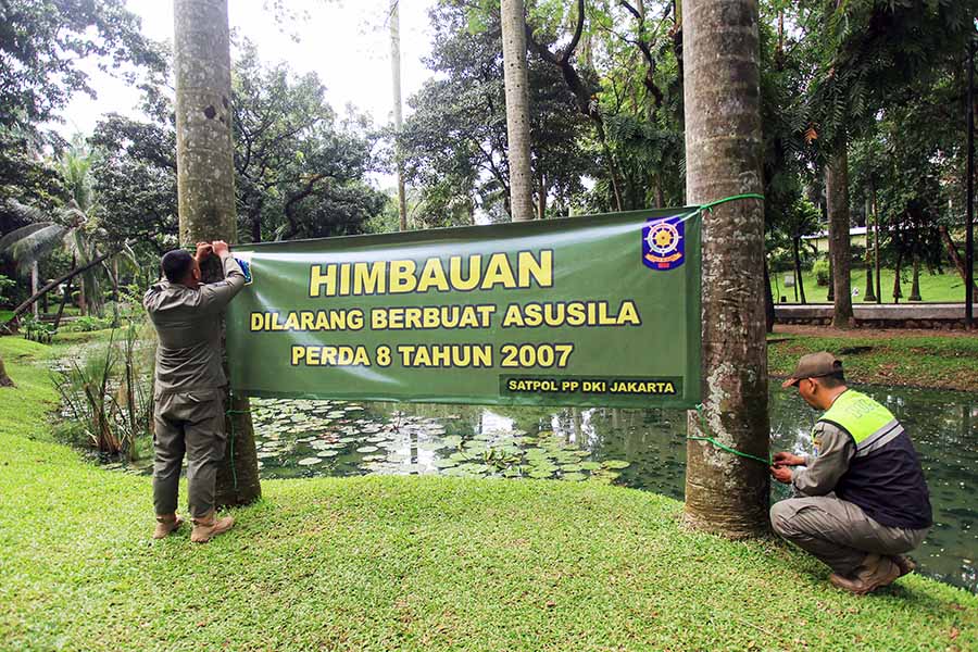 Petugas Satpol PP Jakarta Selatan memasang spanduk Embargo berbuat asusila di Taman Langsat, Kebayoran Baru, Jakarta, Selasa (17/6/2025). Pemkot Jaksel memasang belasan spanduk di taman yang baru saja dibuka 24 jam Kepada masyarakat tersebut Kepada mengedukasi Penduduk masyarakat agar lebih sadar akan pentingnya menjaga Kebiasaan dan tata tertib di ruang publik. ANTARA/Reno Esnir/gus