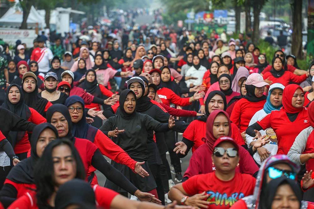 Masyarakat antusian melakukan olahraga Ketika penyelenggaran perdana Car Free Day (CFD) di Podomoro Golf View, Depok, Minggu (22/06/2025). Partisipasi aktif masyarakat memanfaatkan momen Demi berolahraga, bersosialisasi, dan menikmati ruang publik yang sehat di kawasan superblok yang dikembangkan oleh Mulia Podomoro Land ini. Fenomena ini mencerminkan perubahan pola hidup masyarakat yang semakin aktif dan sadar akan pentingnya gaya hidup sehat.  MI/Usman Iskandar