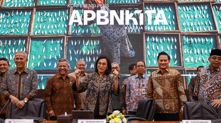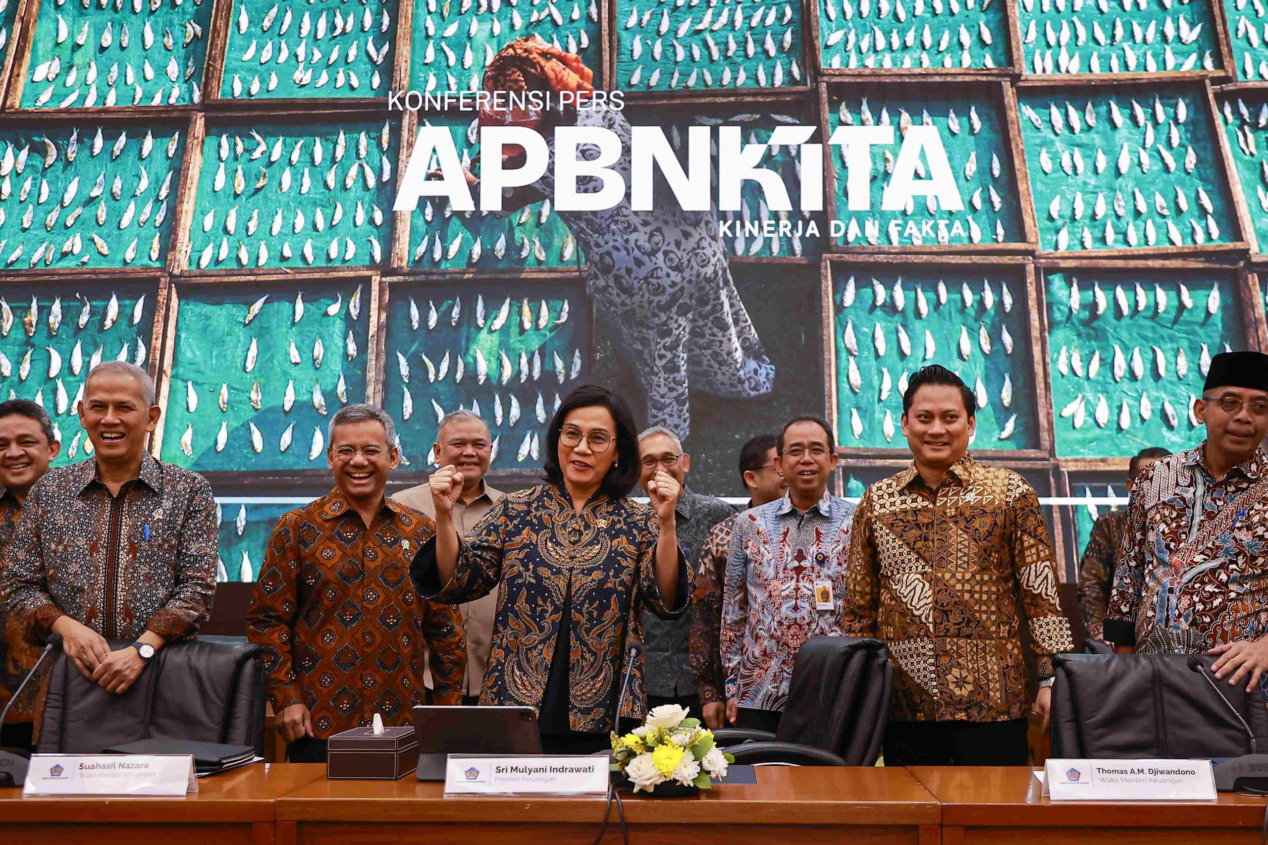 Menteri Keuangan Sri Mulyani Indrawati (ketiga kiri) Berbarengan Wakil Menteri Suahasil Nazara (kedua kiri), Anggito Abimanyu (kiri), Thomas A. M. Djiwandono (kedua kanan), Sekretaris Jenderal Heru Pambudi (ketiga kanan) dan Direktur Jenderal Pajak Suryo Utomo (kanan) bersiap mengikuti konferensi pers APBN KiTa di Jakarta, Kamis (13/3/2025). Menteri Keuangan melaporkan Anggaran Pendapatan dan Belanja Negara (APBN) per 28 Februari 2025 mengalami defisit sebesar Rp31,2 triliun atau 0,13 persen terhadap Produk Domestik Bruto (PDB). ANTARA FOTO/Dhemas Reviyanto/Ppj