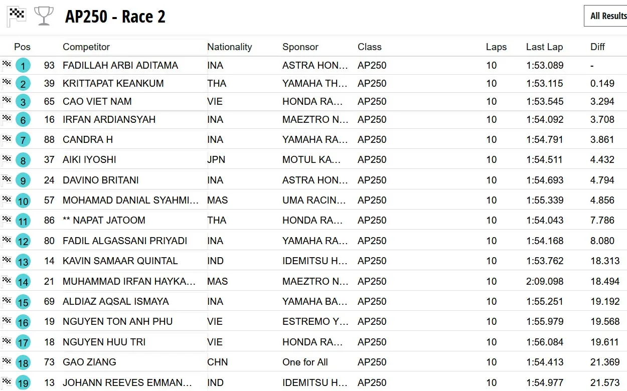 Lap terakhir Arbi sempat memimpin di awal Tetapi berjarak dekat dari Krittapat Keankum. Dan setelah 10 lap akhirnya Arbi Aditama berhasil membawa Honda CBR250RR AHRT memenangkan Race 2 AP250 ARRC Seri 1 Thailand 2025. Krittapat Keankum (Thailand – Yamaha R3) finish di P2. Cao Viet Nam (Vietnam – CBR250RR) finish di P3. – @liputanindo