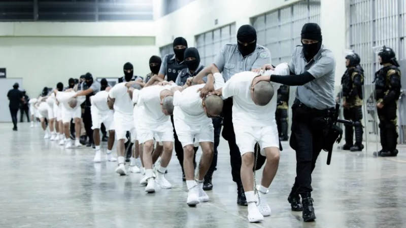 Ia membagikan video beberapa pria yang diborgol dan dibelenggu yang dipindahkan dari pesawat ke konvoi yang dijaga ketat. Kepresidenan El Salvador juga membagikan serangkaian foto imigran dengan kondisi tangan diborgol di belakang punggung mereka.