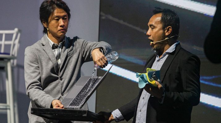 Commercial Director ASUS Indonesia, Yulianto Hasan (kiri) menyiramkan air pada laptop Asus ExpertBook P3 di sela acara Peluncuran Asus Expert P Series di Jakarta, Rabu (04/6/2025). Perusahaan teknologi ASUS meluncurkan tiga produk komersial dari lini Expert P Series terbaru yakni ExpertBook P3, ExpertCenter P400 All-in-One (AiO), dan ExpertCenter P500 Mini Tower yang dirancang Spesifik Kepada memenuhi kebutuhan segmen komersial, bisnis, dan pemerintahan di Indonesia. Ketiga produk Asus tersebut hadir dengan durabilitas tinggi, performa andal dari prosesor Intel generasi terbaru, serta fitur keamanan dan layanan kelas enterprise serta dibekali fitur ASUS AI ExpertMeet, yang memungkinkan transkrip Mekanis, terjemahan real-time, serta watermark pada Berkas rapat. MI/Usman Iskandar
