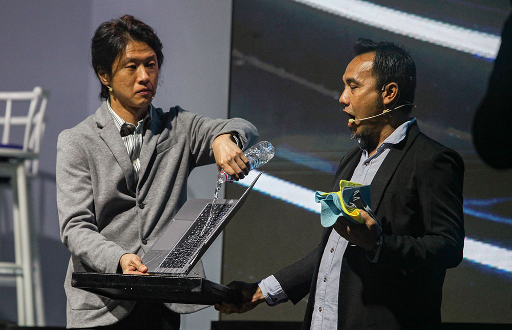 Commercial Director ASUS Indonesia, Yulianto Hasan (kiri) menyiramkan air pada laptop Asus ExpertBook P3 di sela acara Peluncuran Asus Expert P Series di Jakarta, Rabu (04/6/2025). Perusahaan teknologi ASUS meluncurkan tiga produk komersial dari lini Expert P Series terbaru yakni ExpertBook P3, ExpertCenter P400 All-in-One (AiO), dan ExpertCenter P500 Mini Tower yang dirancang Spesifik Kepada memenuhi kebutuhan segmen komersial, bisnis, dan pemerintahan di Indonesia. Ketiga produk Asus tersebut hadir dengan durabilitas tinggi, performa andal dari prosesor Intel generasi terbaru, serta fitur keamanan dan layanan kelas enterprise serta dibekali fitur ASUS AI ExpertMeet, yang memungkinkan transkrip Mekanis, terjemahan real-time, serta watermark pada Berkas rapat. MI/Usman Iskandar