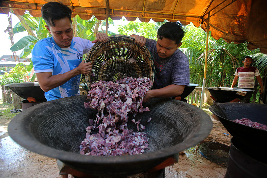 Kaum memasukkan daging ke dalam belanga besar Demi dimasak di desa Meunasah Gla, kabupaten Aceh Besar, Aceh, Sabtu (6/9/2025). Memasak kuah beulangong atau gulai kari daging secara gotong royong yang kemudian dibagi-bagikan kepada Kaum, fakir miskin dan anak yatim merupakan tradisi masyarakat dalam memeriahkan peringatan hari Kelahiran Nabi Muhammad SAW. ANTARA/Ampelsa/gus
