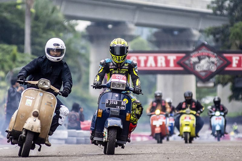 Pembalap motor memacu kecepatan Demi mengikuti Classic Bike Race (CBR) 2024 kategori vespa standar di Sirkuit Brigif Cimahi, Kota Cimahi, Jawa Barat, Sabtu (7/12/2024). Balapan motor klasik yang digelar oleh Bikers Brotherhood MC (BBMC) Indonesia tersebut diikuti oleh ratusan pembalap dari berbagai daerah dengan melombakan 24 kelas yang bertujuan Demi menyalurkan minat dan Bakat sekaligus ajang silaturahim antarkomunitas motor klasik. ANTARA/Abdan Syakura/gus