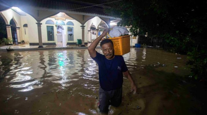 Anggota membawa barang Buat mengungsi Demi terjadi banjir di kecamatan tengahtani, Kabupaten Cirebon, Jawa Barat, Sabtu (18/1/2025). Ratusan rumah Anggota di daerah tersebut terendam banjir akibat tanggul sungai Cipager jebol. ANTARA FOTO/Dedhez Anggara/Per