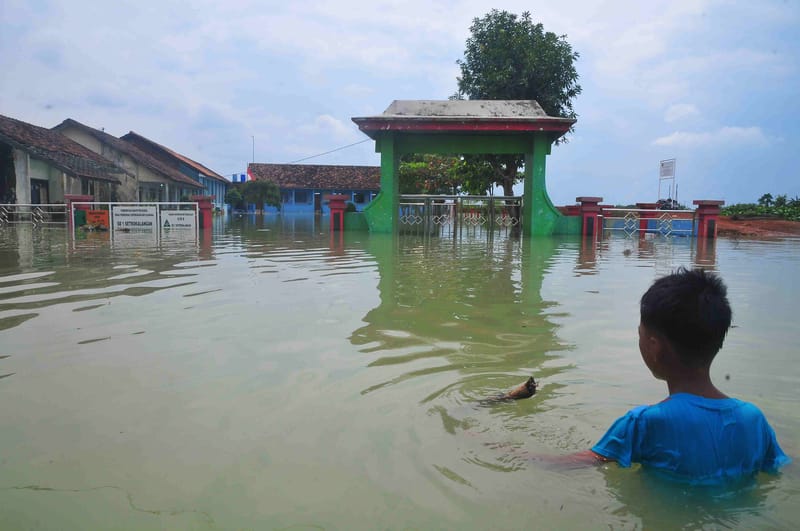 Anggota berjalan melintasi jalan yang tergenang banjir di Desa Setrokalangan, Kaliwungu, Sakral, Jawa Tengah, Jumat (24/1/2025). Menurut data BPBD Sakral per Jumat (24/1), banjir akibat intensitas hujan yang tinggi di Daerah hulu yang menyebabkan meluapnya air Sungai Wulan itu merendam 185 rumah di lima desa di Kecamatan Kaliwungu dan Jati dan sebanyak 1.091 KK/3.556 Jiwa terdampak serta 58 Jiwa mengungsi. ANTARA FOTO/Yusuf Nugroho/Per
