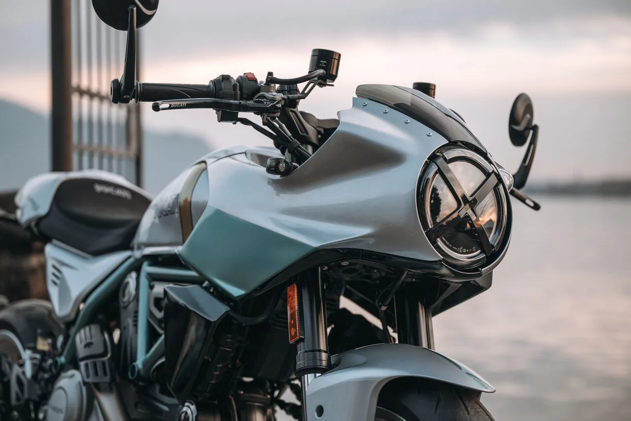 Gaya Café Racer: Penggunaan setang clip-on dengan spion bar-end, serta fairing pendek yang meruncing (tapered) memberikan Kepribadian Urban Café Racer yang sangat kuat Tetapi tetap elegan.