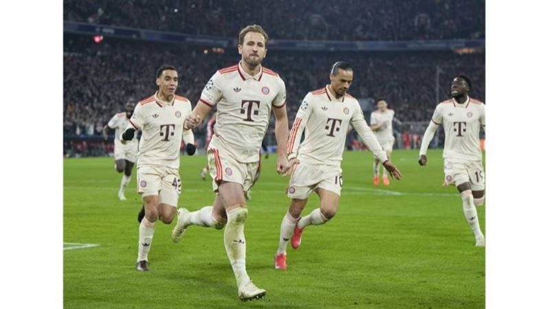 Penyerang Bayern Muenchen Harry Kane melakukan selebrasi usai mencetak gol ke gawang Bayer Leverkusen di laga leg pertama 16 besar Perserikatan Champions.(X @FCBayernEN)