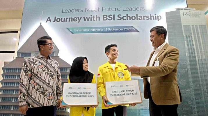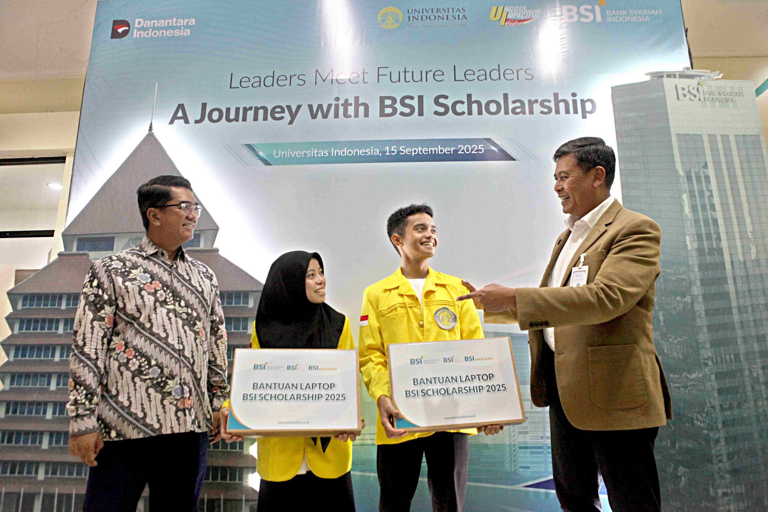 Direktur Esensial Bank Syariah Indonesia (BSI) Anggoro Eko Cahyo (kanan) didampingi Rektor Universitas Indonesia Heri Hermansyah menyerahkan beasiswa dalam peluncuran BSI Scholarship Inspirasi dan Bakat 2025 di UI Depok, Jawa Barat, Senin (15/9/2025). PT Bank Syariah Indonesia Tbk (BSI) memperluas akses pendidikan bagi pelajar berprestasi dari berbagai daerah melalui BSI Scholarship. BSI dan Universitas Indonesia memberikan kembali 65 beasiswa bagi mahasiswa UI berprestasi senilai Rp6,1 Miliar dari total alokasi Rp65,5 Miliar Buat mahasiswa dari seluruh Indonesia. MI/SUSANTO