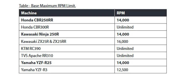 Hal yang mengalami update selanjutnya adalah limit raungan mesin maksimum (base RPM max limit) dimana Demi Sekalian mesin 250cc berkonfigurasi twin (CBR250RR, Ninja 250 dan R25) naik 500rpm dan kini dipatok sama pada Nomor 14.000rpm. Sementara itu Demi motor lain sama seperti tahun Lewat termasuk RPM un-limited Demi motor motor bermesin 1 silinder. – @liputanindo