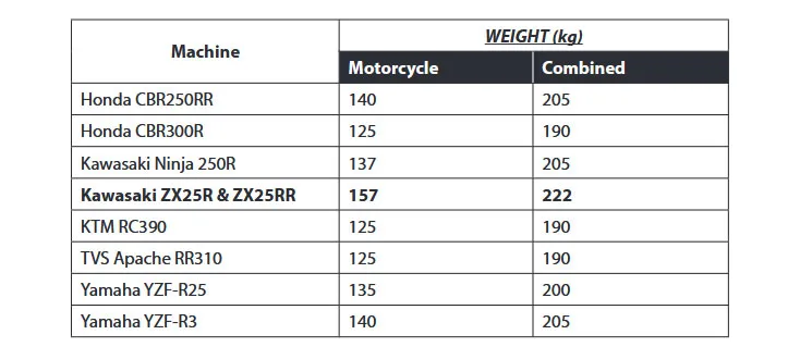 Terlihat Terdapat update Demi musim balap 2025 ini dari Ninja ZX-25R dimana bobot minimal motor 157kg (awalnya 160 kg di 2024) dan bobot kombinasi 222 kg. Menarik Menonton pihak regulator menyamakan bobot minimum dari CBR250RR dan Yamaha R3, seakan-akan kembali bahwa Asia mengakui bahwa walaupun bermesin 249cc Tetapi level performa dari CBR250RR memang baru Dapat dijabani atau selevel oleh Yamaha R3 yang Mempunyai 72cc kubikasi lebih banyak atau tepatnya 321 cc.