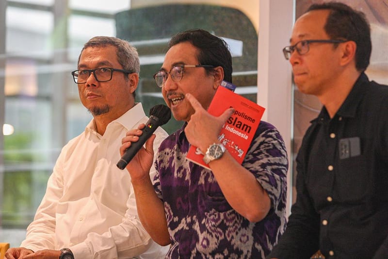 Penulis Naskah Populisme Islam dan Bagaimana Media Memberitakannya?, Usman Kansong (kiri) didampingi dua panelis, yakni Direktur Pemberitaan Media Indonesia, Abdul Kohar (tengah) dan Ketua Dewan Pangawas LPP TVRI, Agus Sudibyo Ketika Percakapan bedah Naskah di Novotel Cikini, Jakarta, Kamis (21/11/2024). Naskah tersebut mengupas tentang populisme Islam yang sering dijadikan komoditas politik Demi kepentingan individu, Golongan atau golongan hingga kekuasaan. MI/Usman Iskandar
